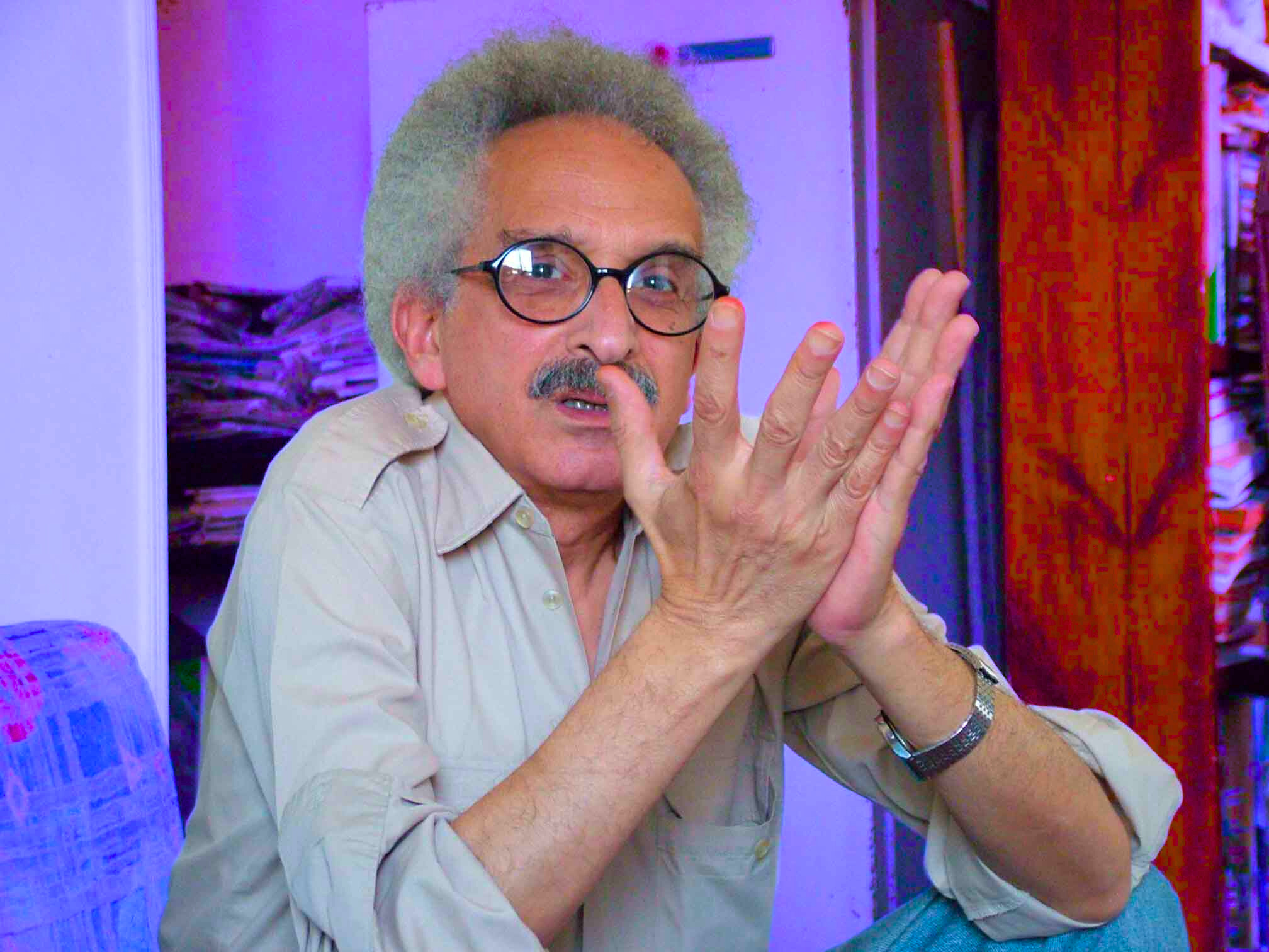 قبل أن يهرب منا، أمسكتْ به مجموعة من الكتاب السوريين والمصريين واللبنانيين والعراقيين. كانت زيارته تلبية لدعوة من مؤسسة المدى للثقافة، في مهرجان صاخب، استضافت فيه نحبة من المثقفين. وقف صنع الله بينهم، غاضباً، نكداً، كمراهق ملول، ولكن بتهذيب.