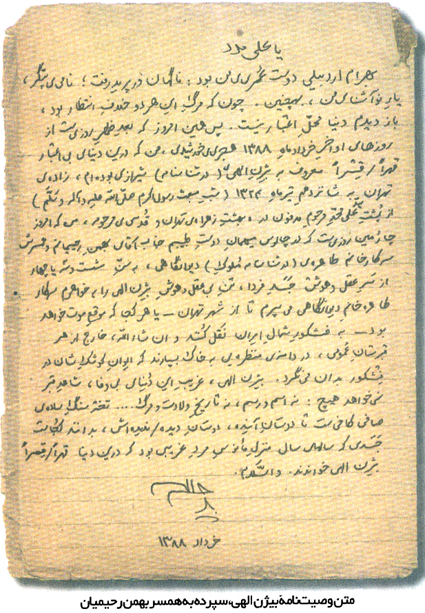 "بیژن إلهي، الغريب في هذا العالم الخؤون، لا يريد أيّ جنازة".